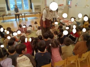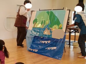 まずはホールに集まり、鮭の一生のお話を聞きました。