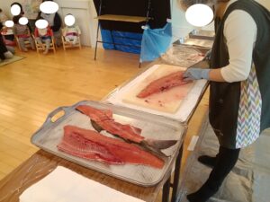 そして、秋の味覚に関するクイズに挑戦した後、鮭の解体を間近で見学しましたよ!