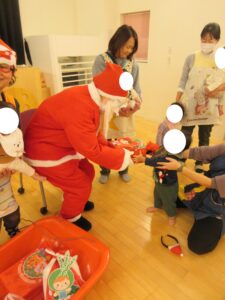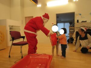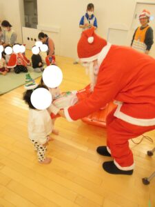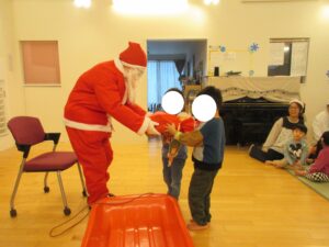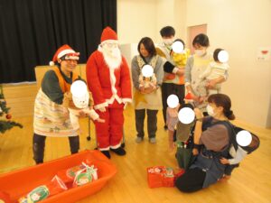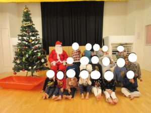 そして、サンタさんからプレゼントを渡してもらいました。各クラスの代表数名がもらいに来てくれました。少し緊張の面持ちでしたが、貰うと嬉しそうでしたよ。最後はサンタさんと集合写真をパシャリ!楽しいクリスマス会になりました!